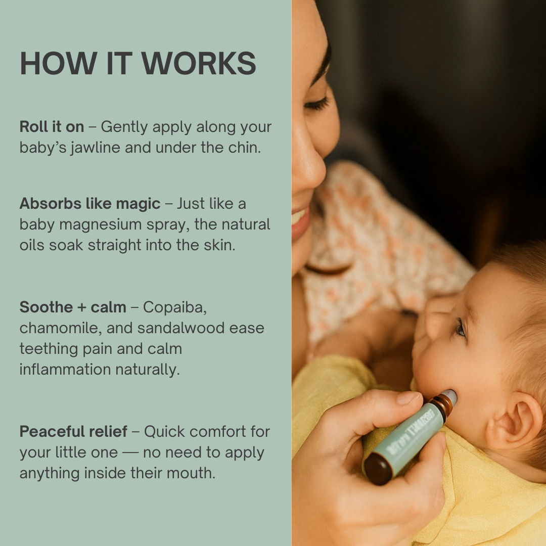 The oils absorb naturally into the skin along your baby’s jawline and under the chin, where teething pain originates.